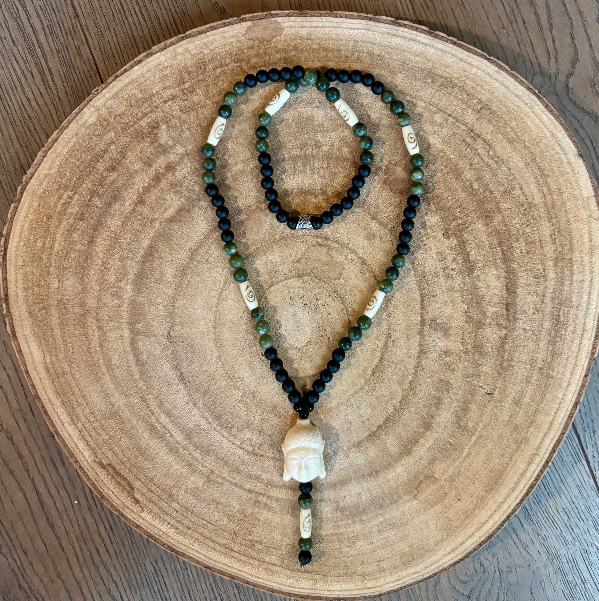 Herenketting met Cremé Boeddha hoofd Keramiek legergroene kralen 8 mm en mat zwarte kralen 8 mm en met tussen acryl kraal met gouden reliëf patroon.