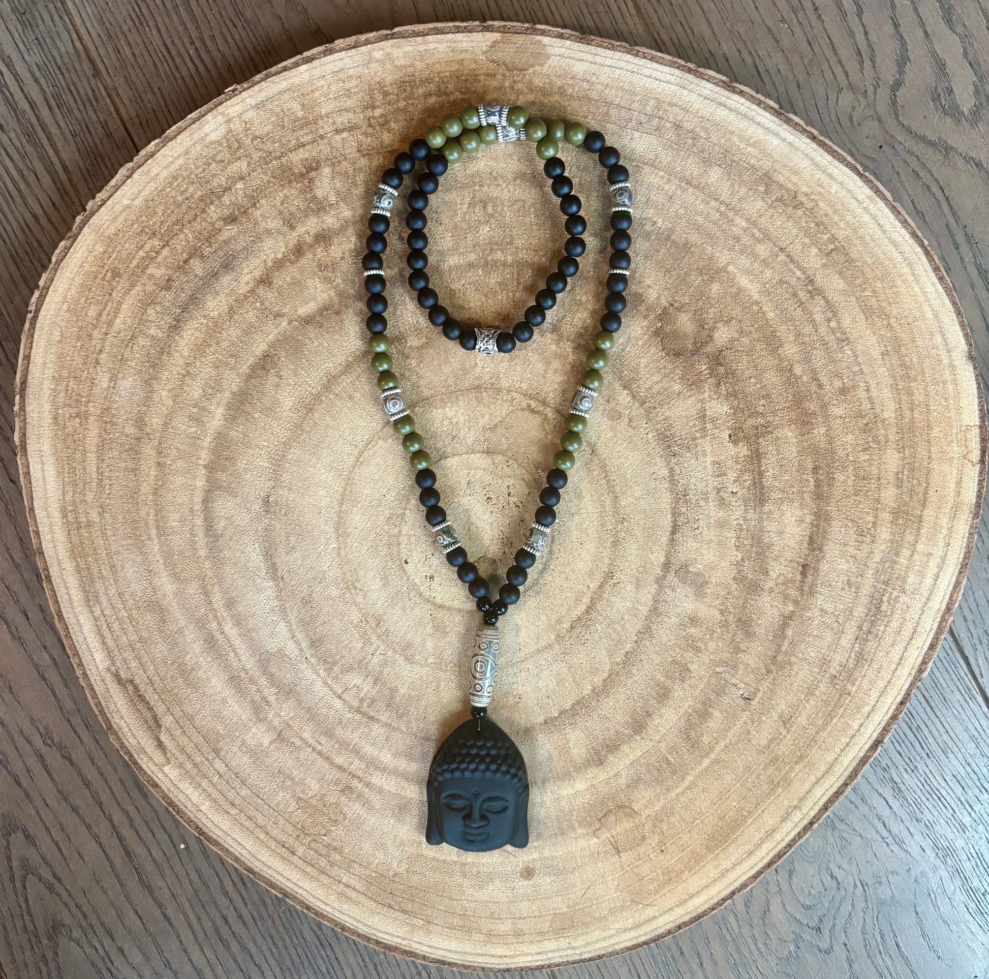 Herenketting met groot boeddha hoofd met tibetaanse kralen. Kralen 8mm mat leger groen en mat zwart.